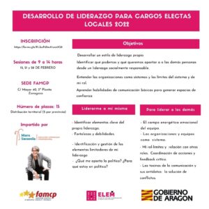 Curso ELEM: Desarrollo de Liderazgo para cargos electas locales. Sesión 1 Sesión 1: Sede FAMCP + Añadir Google Calendar Exportación + iCal / Outlook Fecha Feb 15 2022 Finalizdo! Hora 09:00 - 14:00 Categoría Agenda Compartir este evento