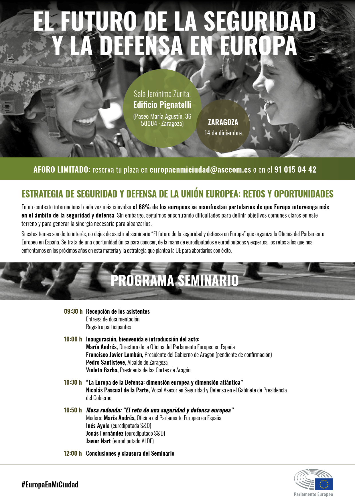 «El Parlamento Europeo organiza el seminario “El futuro de la seguridad y defensa en Europa”, que se celebra en Zaragoza (Sala Jerónimo Zurita. Edif. Pignatelli, Pº de María Agustín, 36) el próximo 14 de diciembre (viernes).
